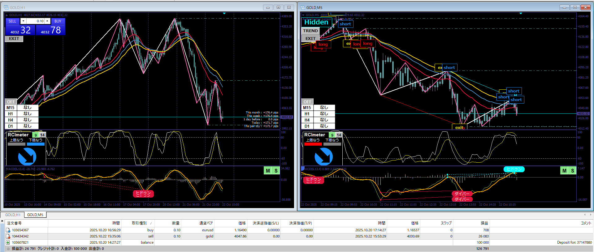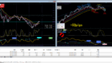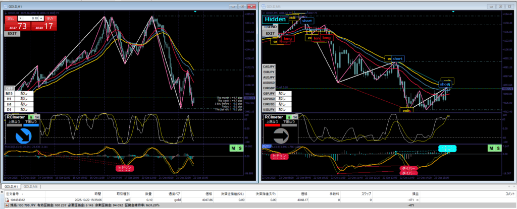 根拠解説:1時間足のGoldは3本の移動平均線の下にローソク足があったので、売り目線でした。そこで、5分足のGoldにもちぽよアラートの売りサインが点灯。ヒドゥンダイバージェンスのサインも出てたので、ローソク足が確定後売りエントリー。ただ、Goldのエントリーロットが大きすぎた感じがありました。10万円の証拠金に対して、0.1はリスク高いかもしれません。